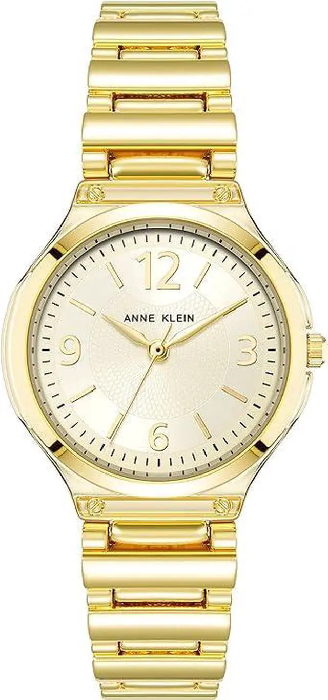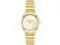 Case Material- Metal (Round). Case Diameter- 30 millimeters. Case Thickness- 9 millimeters. Band Material- Metal. Band Color- Gold. Band Width- 16 millimeters. Dial- Light Champagne textured with Gold-tone hands and markers. Crystal- Mineral Glass. Movement- Japanese Quartz. Clasp- Double Locking Foldover Clasp. Water Resistance- Not water resistant. Special Features- Second Hand.