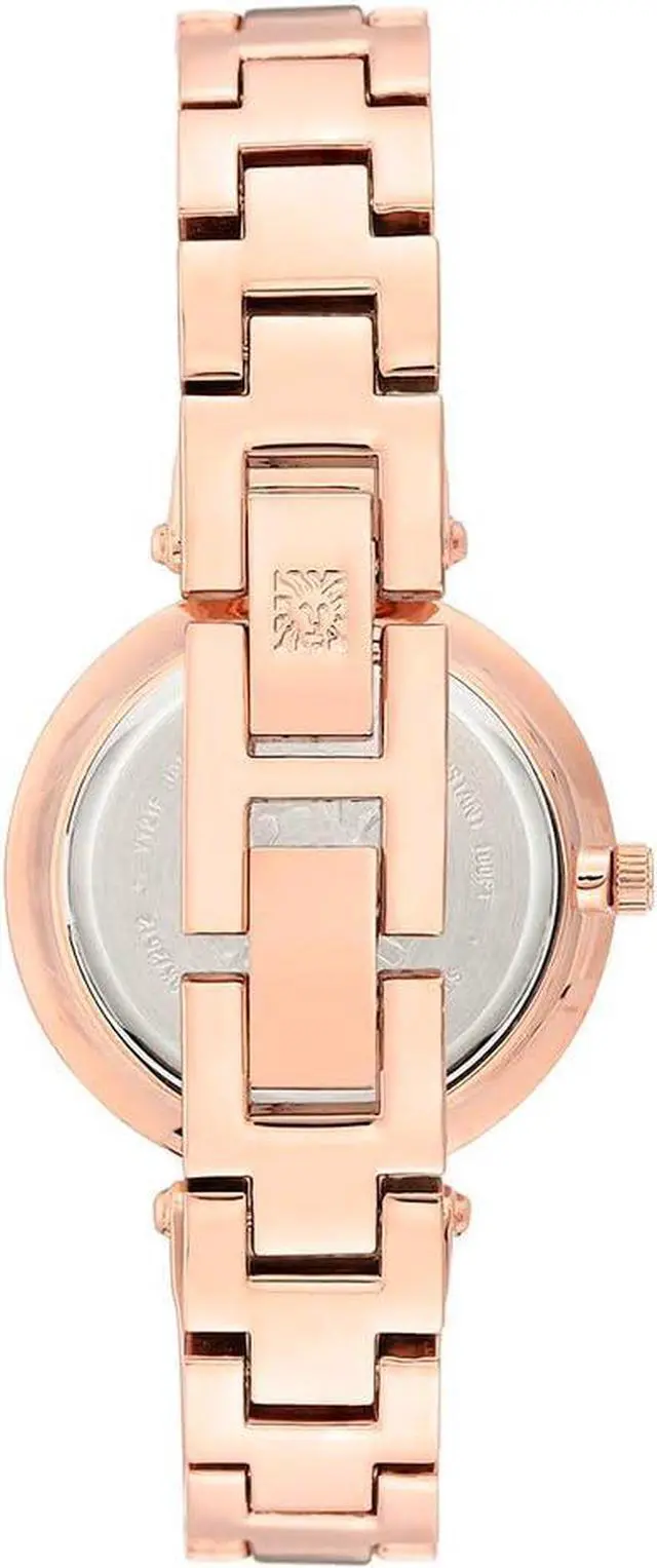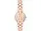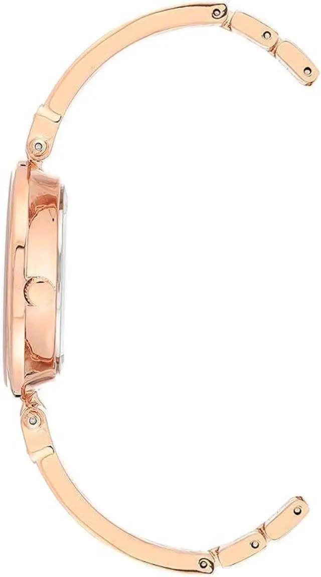 Case Material- Stainless Steel (Round). Case Diameter- 34 mm. Case Thickness- 7 mm. Band Material- Metal Bangle. Band Color- Light Pink and Rose Gold-tone (Marbleized enamel filling). Band Width- 17.5 mm. Dial- Light pink mother-of-pearl with genuine diamond at 12 and luminous rose gold-tone hands. Crystal- Mineral (Slightly domed). Movement- Japanese Quartz. Clasp- Jewelry Clasp with Extender. Water Resistance- 30 meters. Calendar- Day.