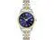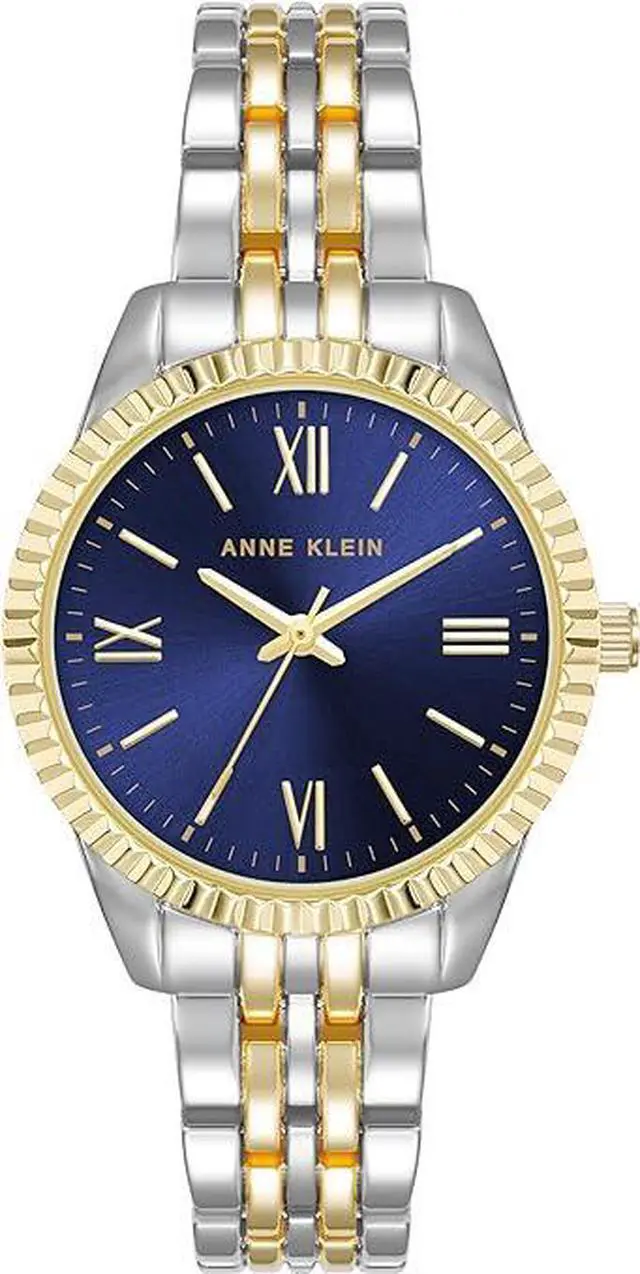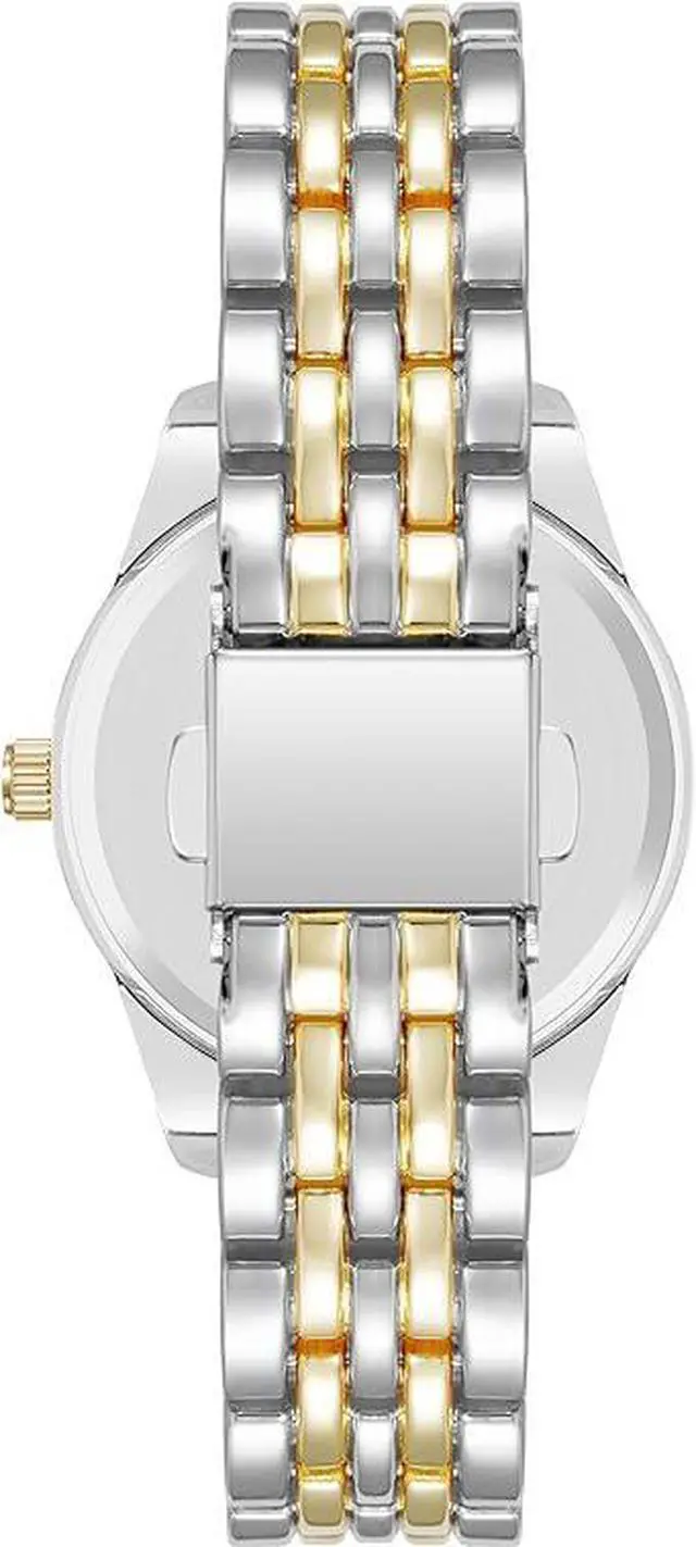 Case Material- Metal (Round). Case Diameter- 30 mm. Case Thickness- 9 mm. Band Material- Metal. Band Color- Two-tone (Silver and Gold). Band Width- 14 mm. Dial- Navy blue sunray with gold-tone hands markers and minute track. Crystal- Mineral Glass. Bezel- Textured metal (Stationary). Movement- Japanese Quartz. Clasp- Double Locking Foldover Clasp. Water Resistance- Not water resistant.