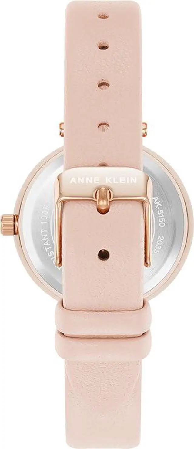 Case Material- Metal (Round). Case Diameter- 32 mm. Case Thickness- 9 mm. Band Material- Sustainable Leather (Blush Pink). Band Color- Blush Pink. Band Width- 8.5 mm. Dial- Blush pink mother-of-pearl with rose gold-tone hands and markers. Crystal- Mineral Glass. Movement- Japanese Quartz. Clasp- Buckle. Water Resistance- 30 meters.