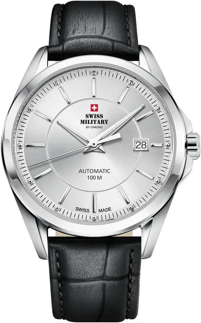 Swiss military by Chrono automatic watch with black leather strap. - Swiss made