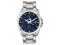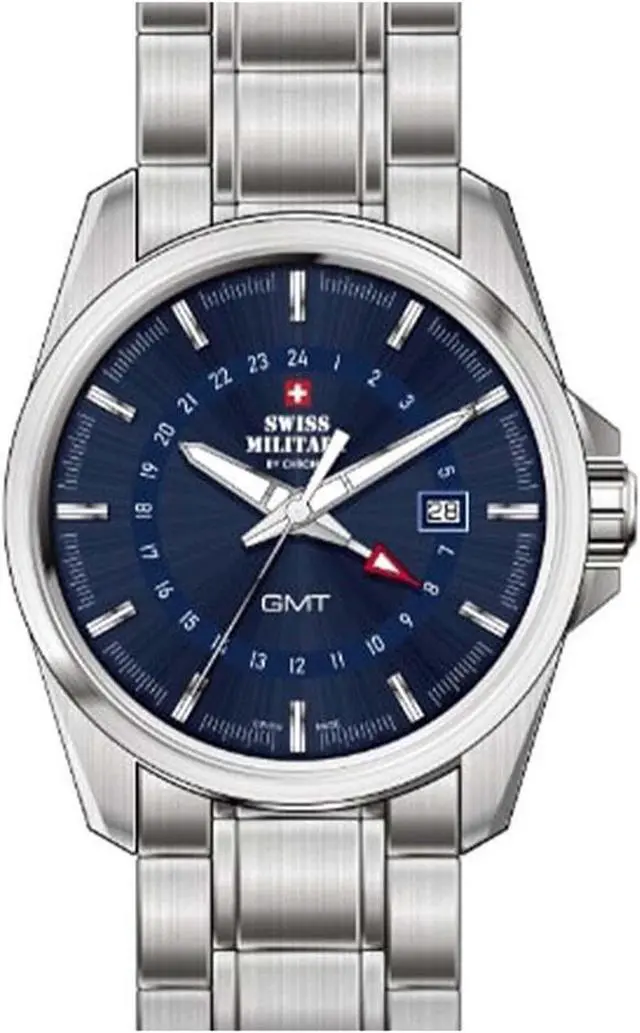 This Classic Swiss Military watch features a silver steel look accompanying a regal blue dial giving it a typical retro look. The stainless steel case embodies a GMT dial with minute and hour tapered type hands running across silver hour markings. Powered by Quartz movement, this watch has a stainless steel strap and a compact bezel that finishes its appearance.