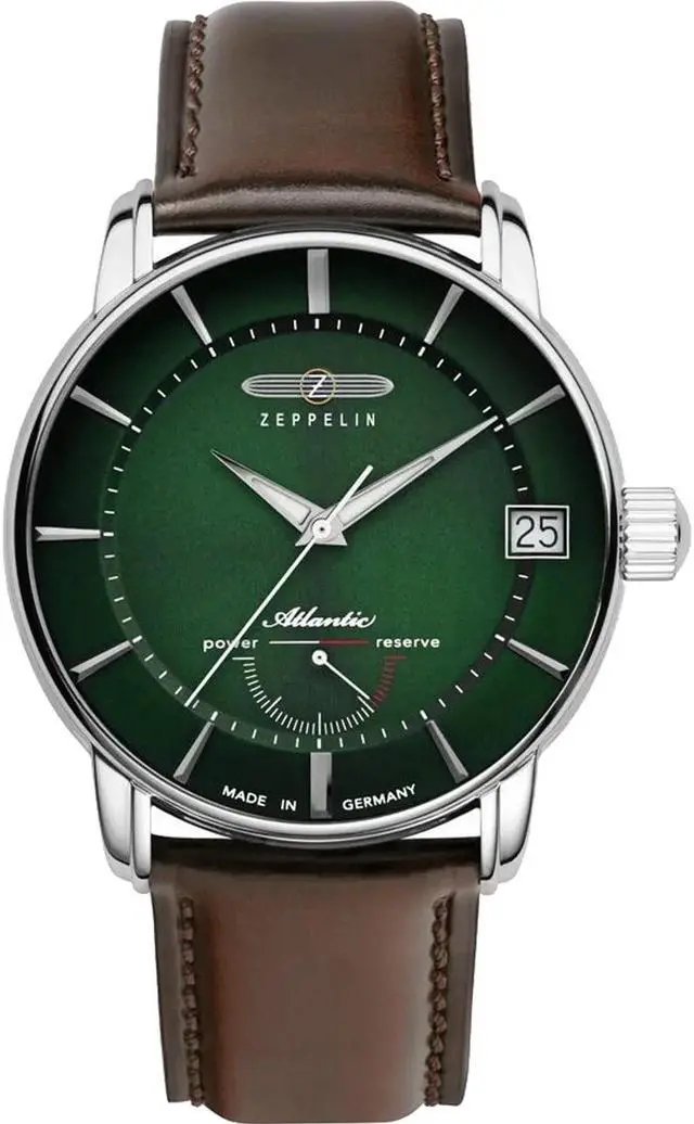 The Zeppelin Atlantic Automatic Limited Edition 8416-4 is a unique men's watch that mixes three colours: brown, green, and silver. The screw-down transparent case back allows you to see the ETA A 07.161 automatic movement with a 48-hour power reserve in action. A day-of-the-month date counter is located on the dial, which is protected by sapphire glass. Super-LumiNova luminous coating is used on the hands and indexes.