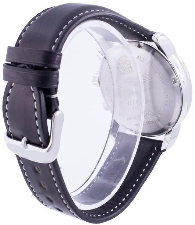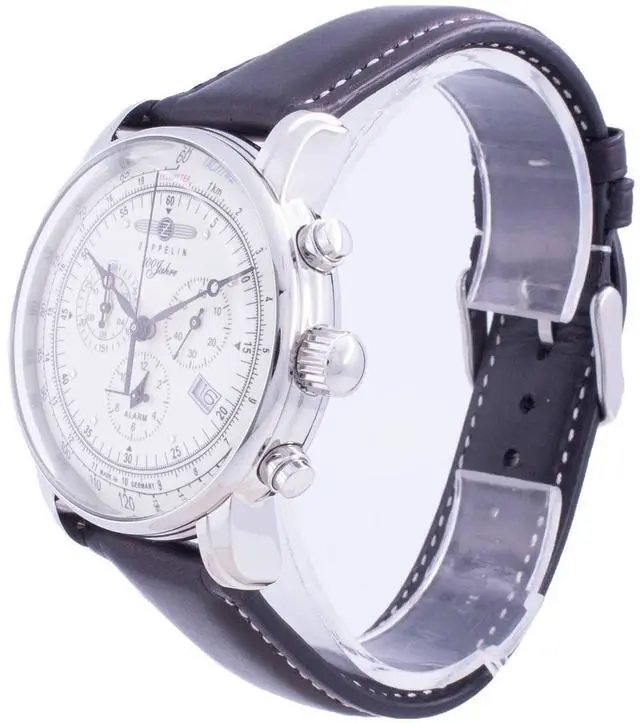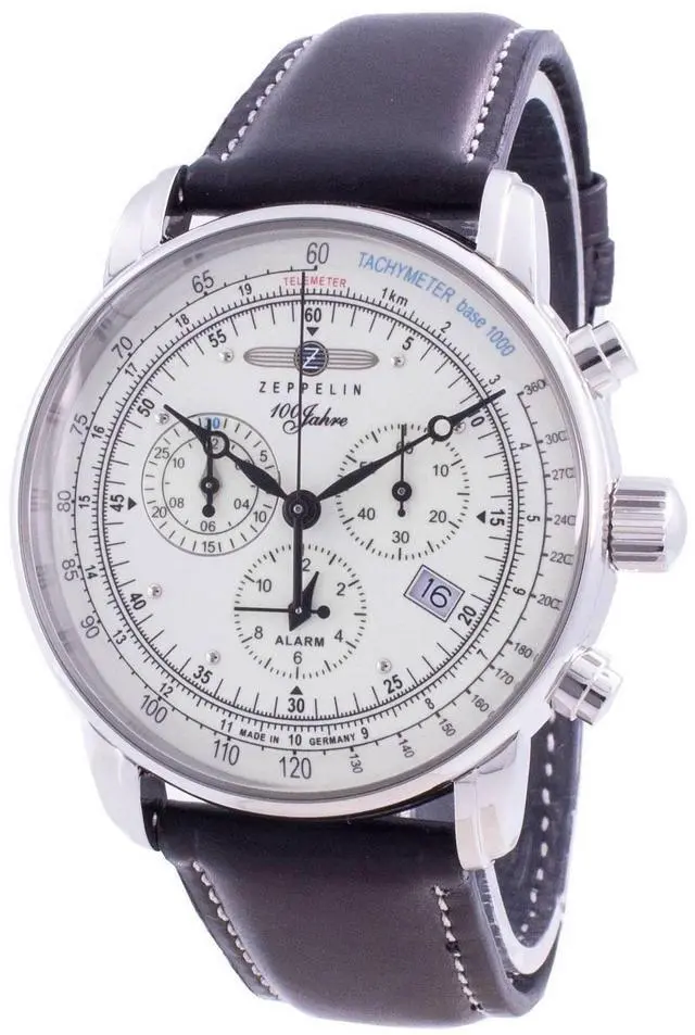 Zeppelin 100 Jahre 8680-3 86803 Quartz Men's Watch Celebrating 100 years of the Zeppelin Air Ship, the The Graf Zeppelin chronograph/alarm watch is one of the most elegant designs that impresses also with its technical sophistication. The timeless beauty of a classic aviation chronograph is presented through a distinctive design by highly qualified German watchmakers. Powered by a Swiss Ronda quartz-controlled chronograph movement with an alarm function and date, its Breguet-styled hands and the tachymeter scale exemplifies one of the best in fineries.