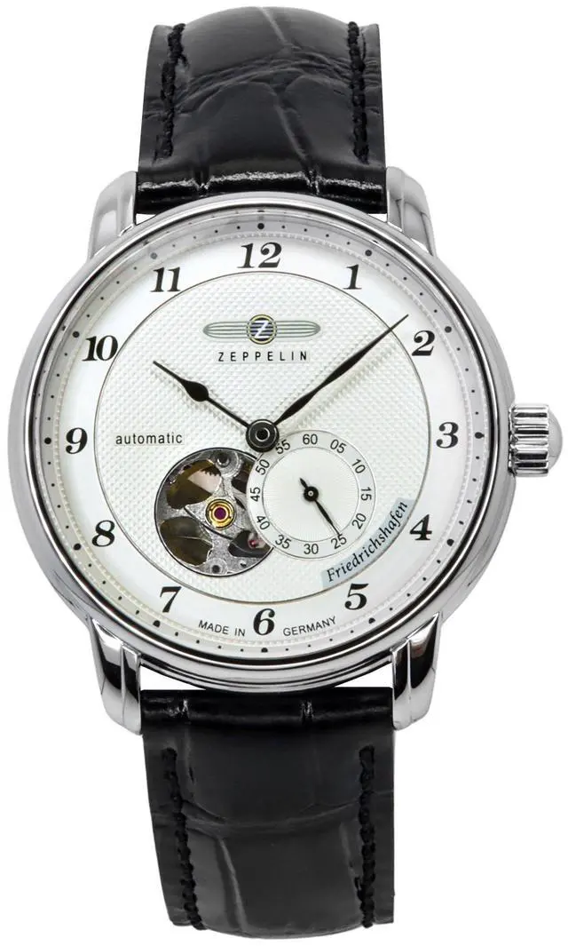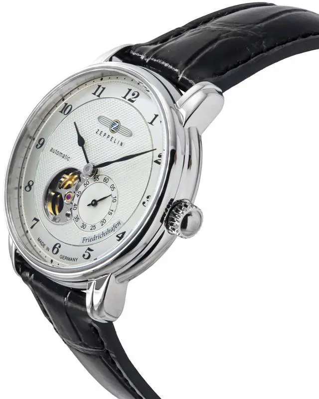 Zeppelin Friedrichshafen Leather Strap Silver Open Heart Dial Automatic 85664 Men's Watch