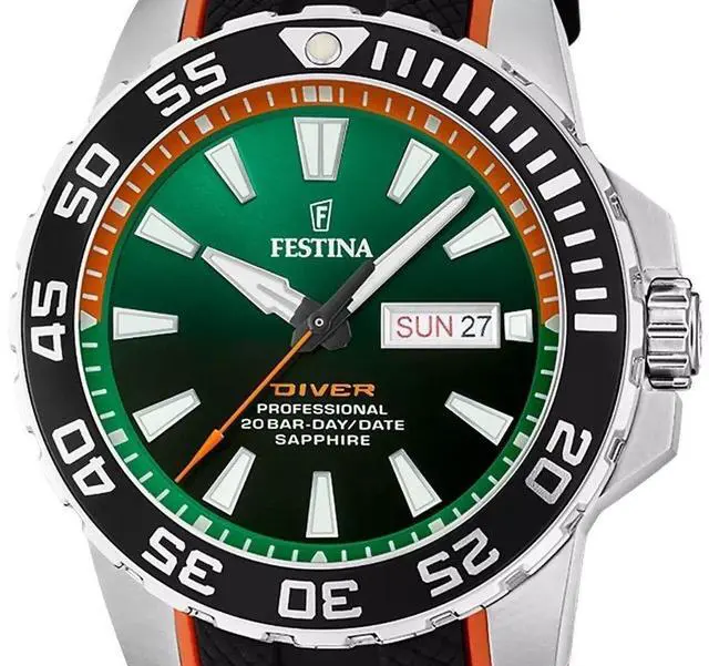 The Festina F20662-2 commands attention with its bold green dial, setting it apart as a diverâs essential. Equipped with 200-meter water resistance, itâs built for underwater exploration. The durable rubber strap adds comfort and resilience, perfect for active wear. Powered by reliable quartz movement, this watch combines style and function, making it an ideal choice for those ready to dive into new adventures with confidence and flair.