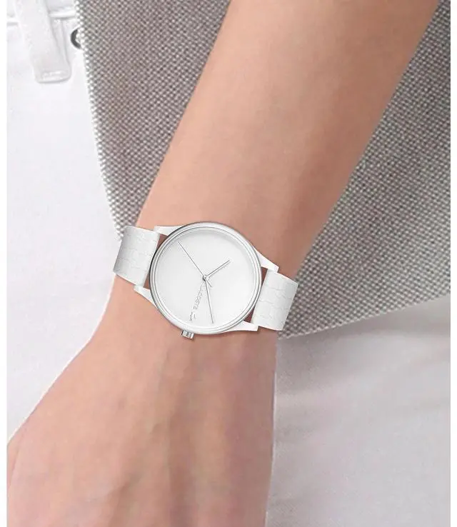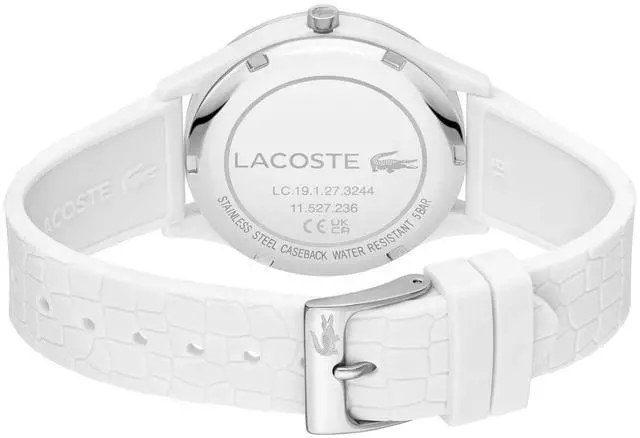 Be fearless and fabulous with this Lacoste Crocodelle White Silicone Women's Watch. Featuring quartz movement, a 36 mm Tr90 case, and an 8.55mm case thickness, this piece is the epitome of style and precision. A white dial and 18mm white silicone strap complete this stunning piece, which also includes a mineral crystal and 5ATM water resistance. Make a statement with this gorgeous watch today!