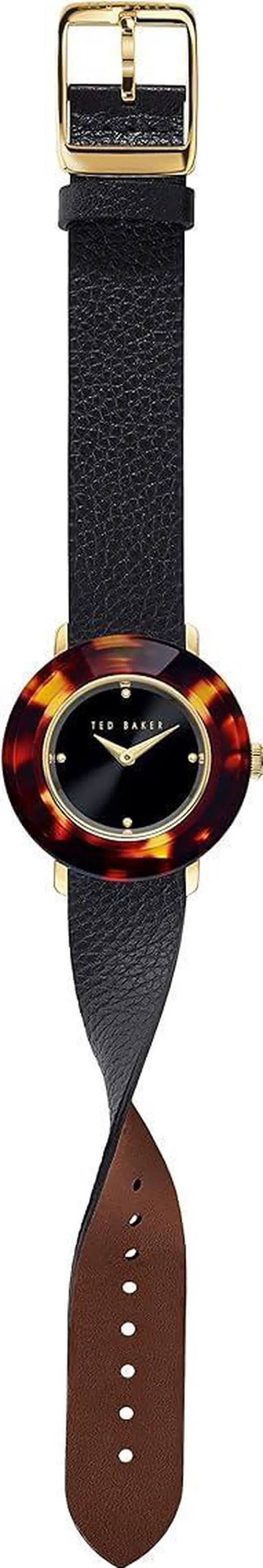 34 mm Round Yellow Gold Tone case in Stainless Steel. Gold-tone analogue dial with Tortoise top ring and yellow Gold Tone hands. Reversible Black/Brown slip-thru Genuine Leather strap. Exclusive Ted Baker design on the back of the strap. Quartz movement with 2 hand analogue display. mineral crystal face. Water resistant to 50 meters.