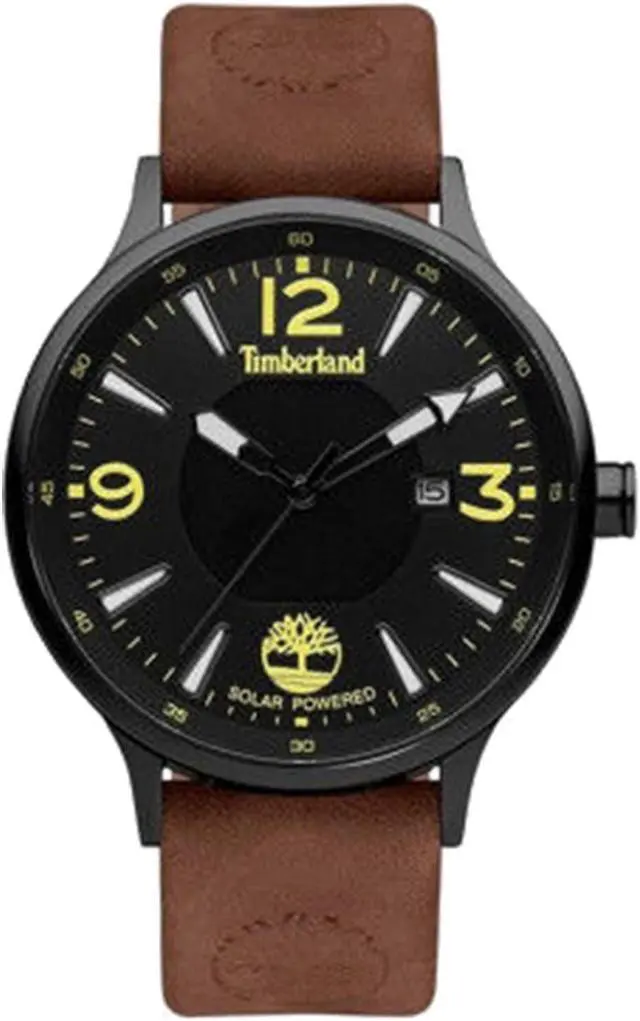 Introducing the Marblehead 3H Black Dial Brown Leather Watch by Timberland, a stylish and eco-friendly timepiece. The 43mm steel case offers durability, while the genuine leather strap provides both comfort and sophistication. Powered by solar movement, this analog watch features a calendar function and 3 hands for accurate timekeeping. The standard clasp ensures a secure fit, and the brown chain bracelet adds a touch of elegance. With a water-resistance capacity of up to 50 metres, a matte black diagram, and a 3-year warranty, this round-shaped watch is a perfect choice for environmentally conscious men who appreciate both style and sustainability.