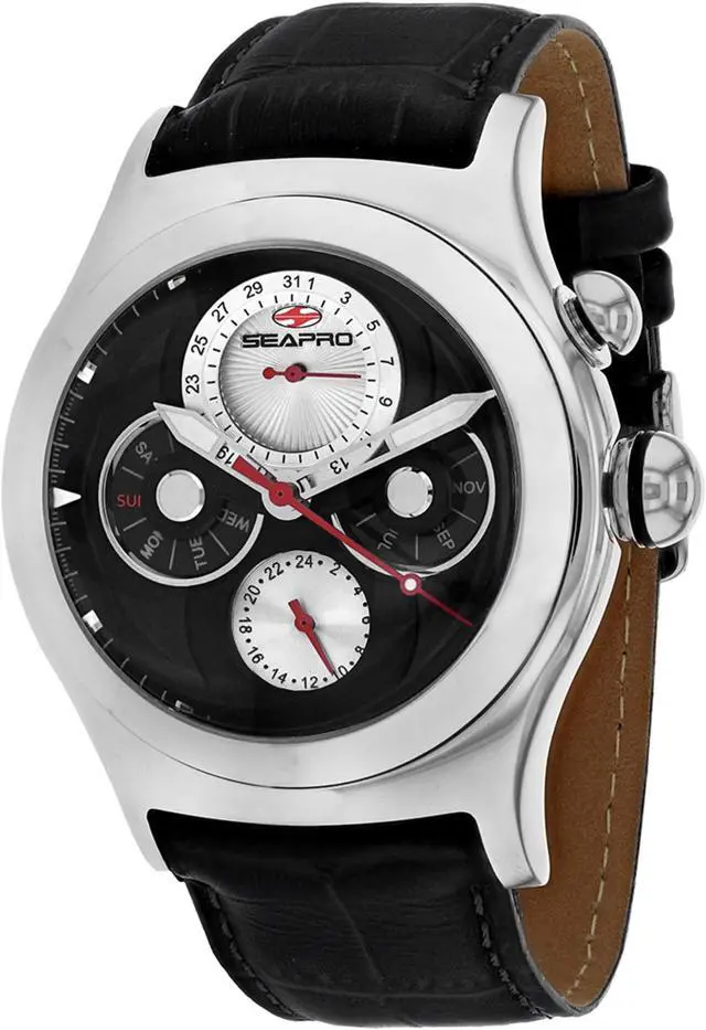 Stainless steel case, Leather strap, Black dial, Quartz Movement, Scratch resistant mineral, Water resistant up to 5 ATM - 50 meters - 165 feet