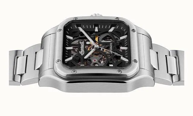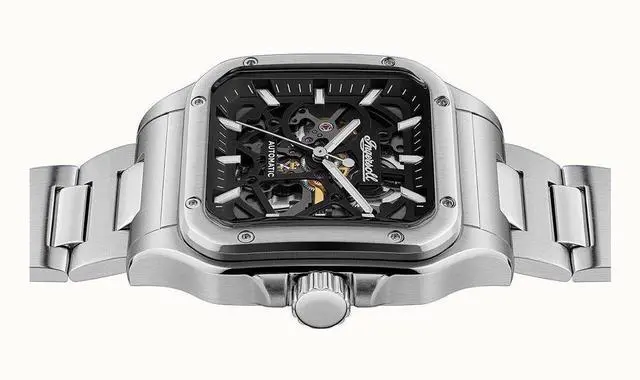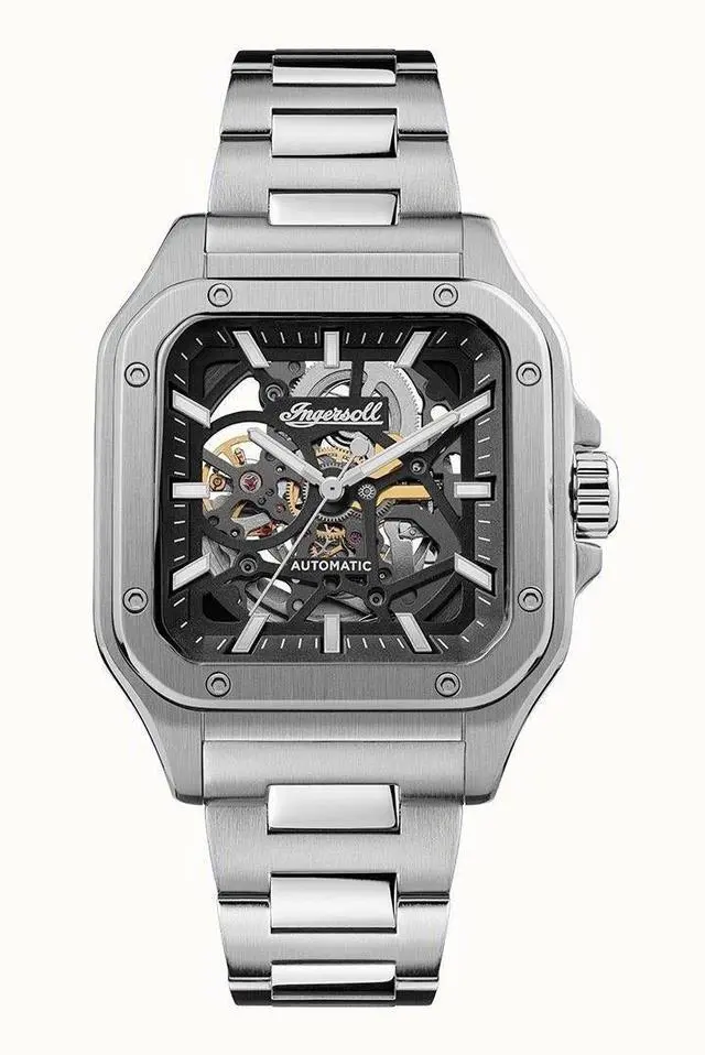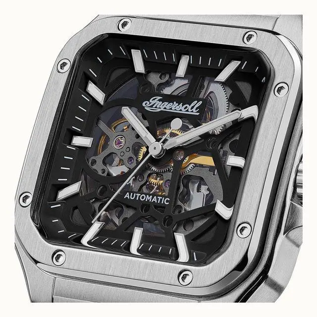 The Ingersoll I14501 is a modern masterpiece featuring a stainless steel case and bracelet, providing durability along with a sleek look. The black skeleton dial, protected by a scratch-resistant mineral crystal, reveals the intricate automatic movement. Key features include an analog display, luminous hands and markers for enhanced readability, and a see-through case back exposing intricate mechanical movements. The deployment clasp ensures a secure fit, while the 50m water resistance makes it suitable for everyday wear and minor water exposure.