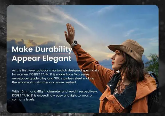 • 1Designed for Women - KOSPET Tank S1 is led by famous designer Carolino, the body is only 48g and 13MM thick, which is the thinnest and lightest women's outdoor smartwatch at present; high-end aluminium alloy bezel design and edible-grade super-soft strap, which brings you a very comfortable feeling. Showing women's elegant charm, it is the best choice for modern fashionable women.