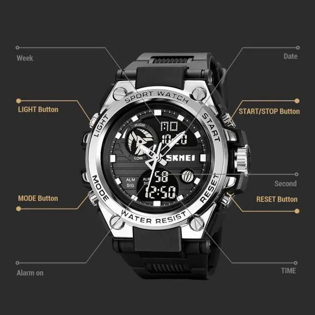 1. Functions: dual time, stopwatch timing, LED night light, date display, timing alarm, week display, hourly timekeeping, 12/24 hour format