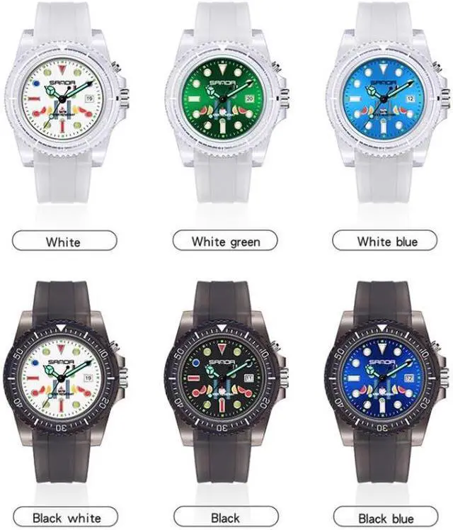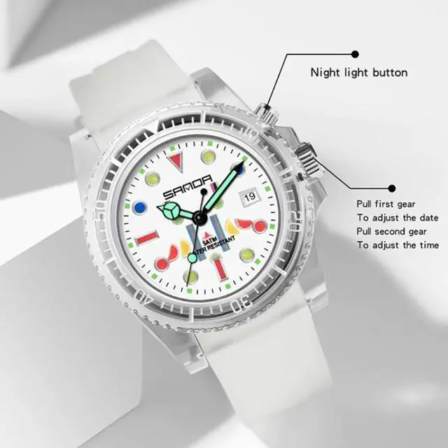 SANDA 6078 Fluorescent Calendar Dial Transparent Strap Quartz Watch for Women (Transparent White Belt Blue Surface) Black