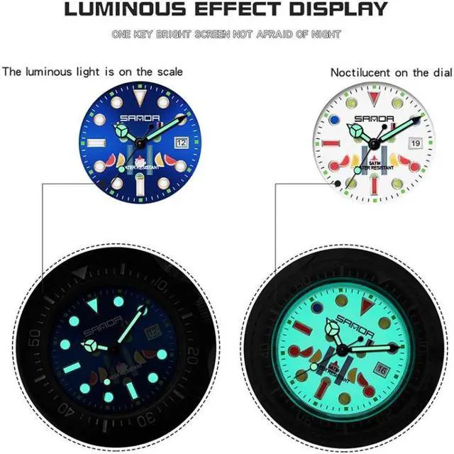 11. Function: Built-in luminous movement, one-key bright screen, 50m waterproof, fluorescent, time, calendar
