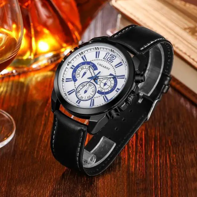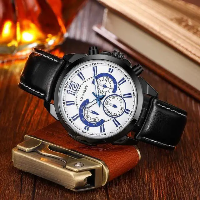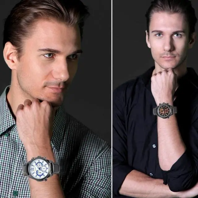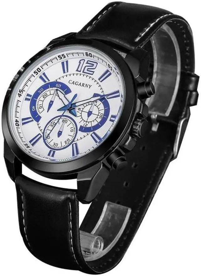 1. Fashionable large dial, quartz movement, concise style men's wrist watch. 2. High quality leather band and alloy case. 3. With life waterproof, 24-hour indication and calendar functions. 4. Clasp type: buckle. 5. Built-in battery.