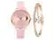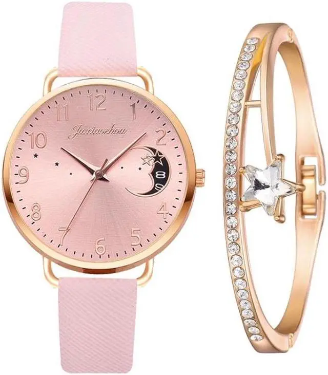 Ladies Moon Pattern Dial PU Strap Quartz Watch, Color: Pink+Bracelet Pink+Bracelet