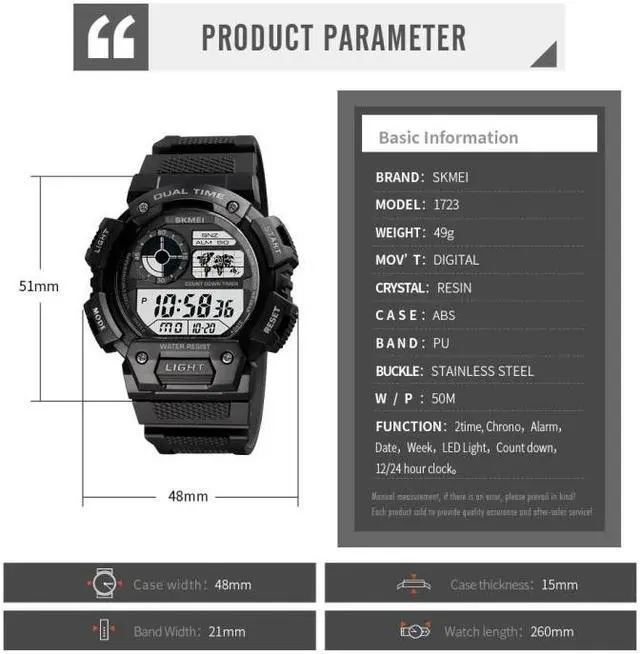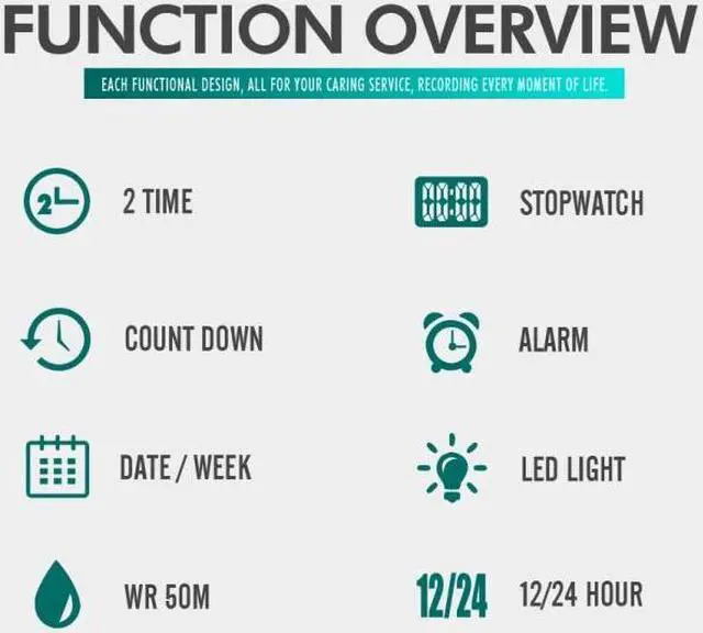 8. Functions: dual time, stopwatch timing, luminous, date display, timing alarm, display day of the week, hourly hour, 12/24 hour system, countdown