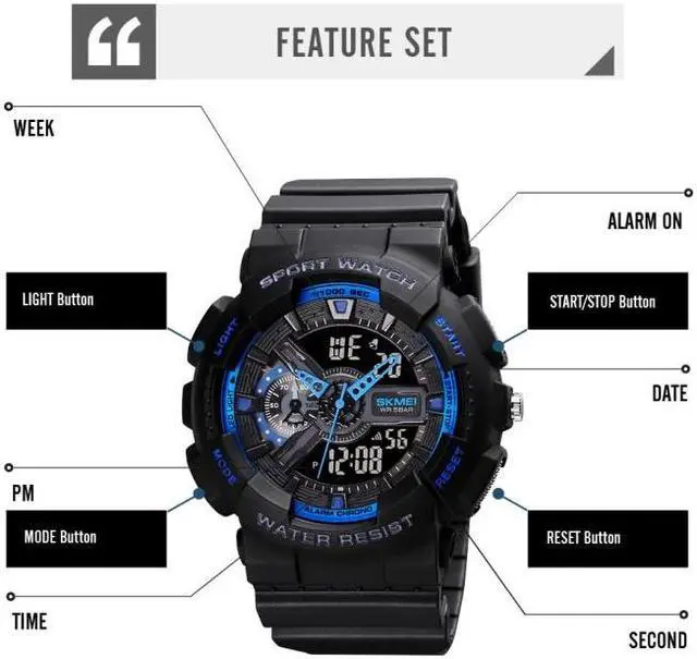 8. Functions: 2 time, stopwatch timing, date display, timing alarm, display day of the week, night light, 12/24 hour system