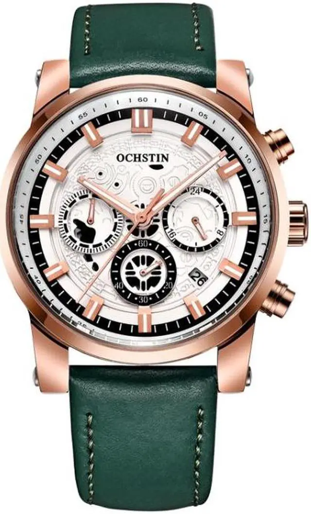 Ochstin 5111B Multifunctional Business Waterproof Luminous Leather Strap Quartz Watch (Rose Gold+Green)
