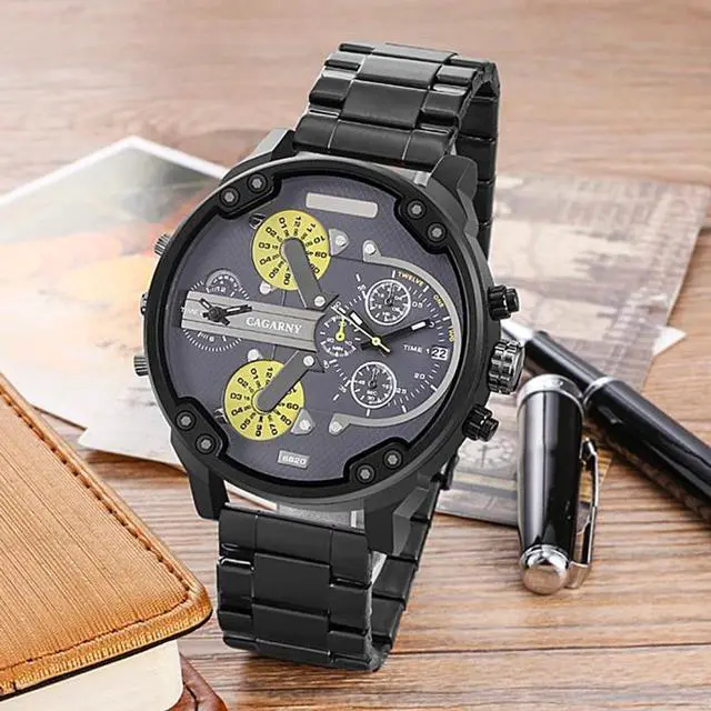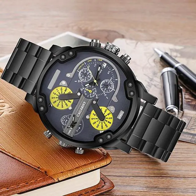 CAGARNY 6820 Fashionable Business Style Large Dial Dual Time Zone Quartz Movement Wrist Watch with Stainless Steel Band & Calendar Function for Men (Style 4)