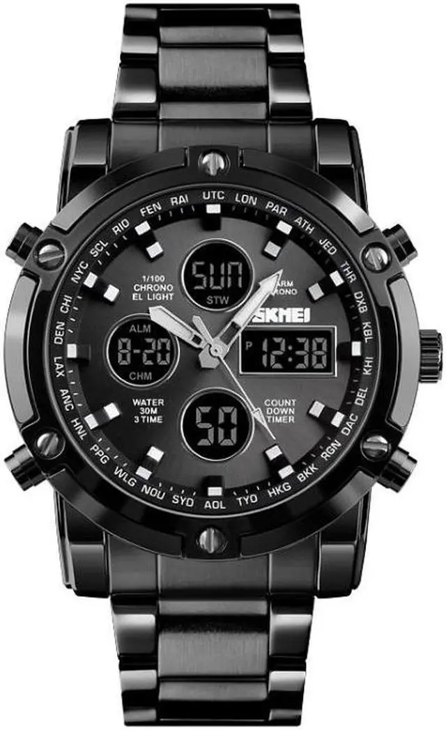 SKMEI 1389 Multifunctional Men Business Digital Watch 30m Waterproof Large Dial Wrist Watch with Stainless Steel Watchband (Silver+Black)