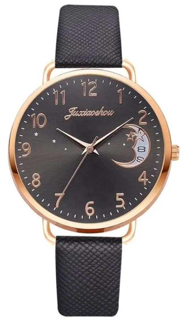 Ladies Moon Pattern Dial PU Strap Quartz Watch, Color: Black Black
