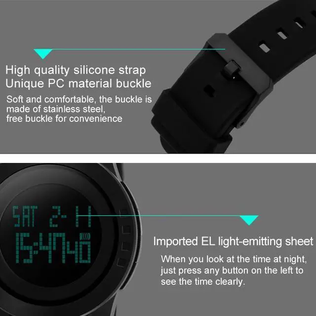 5. Function: stopwatch timing, luminous, display date, timed alarm, display week