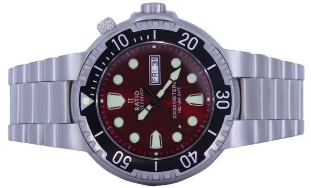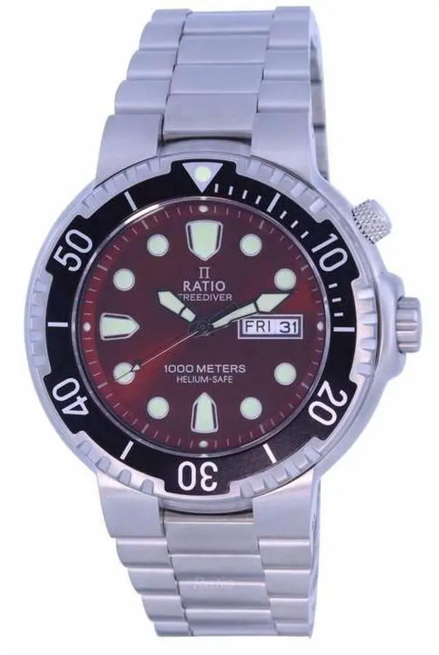 Ratio FreeDiver Red Dial Stainless Steel Quartz 1050HA93-02V-RED 1000M Men's WatchThis watch from the relatively new micro brand answers to each of the many demands of outdoor lovers. Marked by an outstanding resilience, its precision is impeccable and it excels on every context of reliability, both overall and with individual components. It fulfils all imperative factors for seasoned divers while not overwhelming the casual wearer with them. An excellent, tool-diver watch!