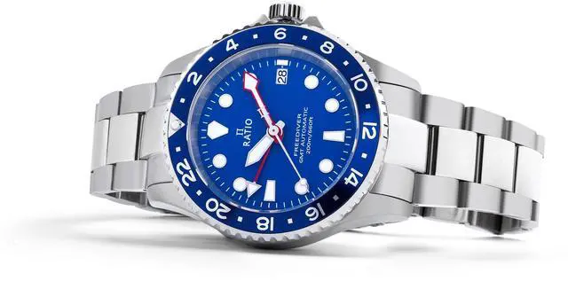 Ratio FreeDiver GMT Series Sapphire Stainless Steel Blue Dial Automatic RTF053 200M Men's Watch The RATIO RTF053 captivates with its vibrant blue dial, perfectly highlighting the GMT function, ideal for those who need to track multiple time zones. Its durable stainless steel case and sapphire crystal ensure longevity and scratch resistance. Powered by automatic movement, this watch guarantees reliable, battery-free timekeeping. With 200-meter water resistance, it's designed for diving and other water adventures, combining rugged functionality with refined style for everyday wear and exploration.
