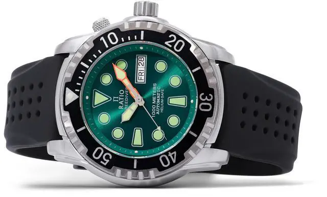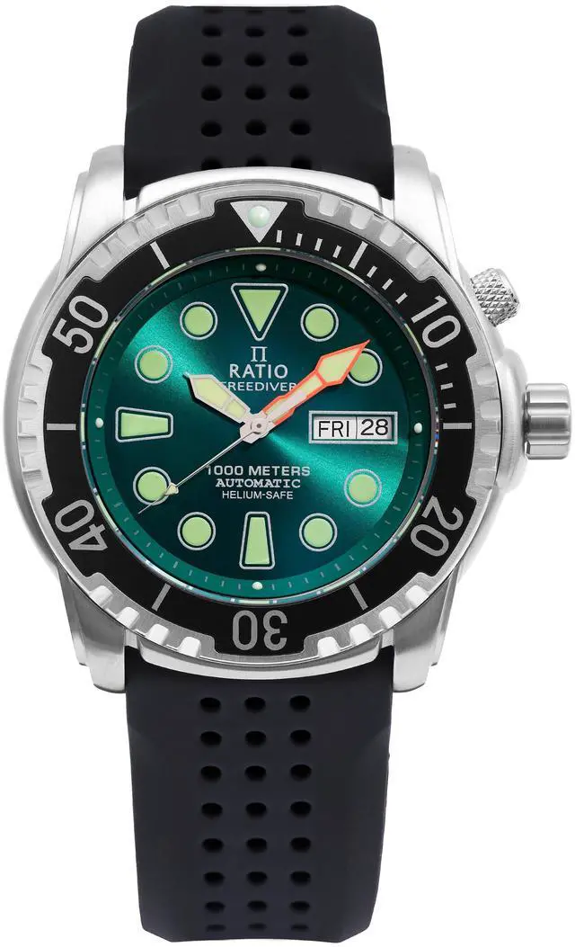 Ratio FreeDiver Version 02 Helium Safe 1000M Sapphire Automatic Green Dial 1068HA90-34VA-GRN-V02 Men's Watch  Immerse yourself in adventure with the 1068HA90-34VA-GRN-V02's striking green dial, a feature that blends bold aesthetics with exceptional visibility. The automatic movement delivers precise and consistent timekeeping, ideal for extreme conditions. Sapphire crystal provides top-tier scratch resistance, maintaining the watchâs pristine look. With 1000m water resistance and helium safety, this watch is engineered for professional divers who demand both high performance and a distinctive design.