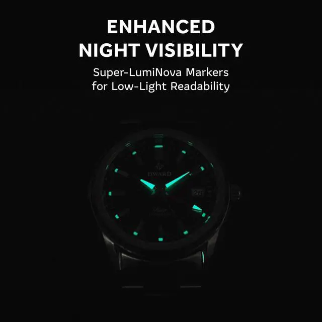 Luminescent markers and hands use Super-LumiNova pigments, providing excellent visibility in low-light environments.
