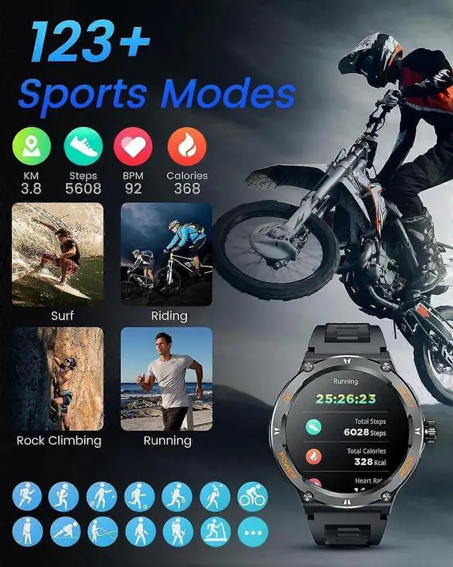 123 sport modes to record steps, distance, calories, and activity time for comprehensive fitness tracking
