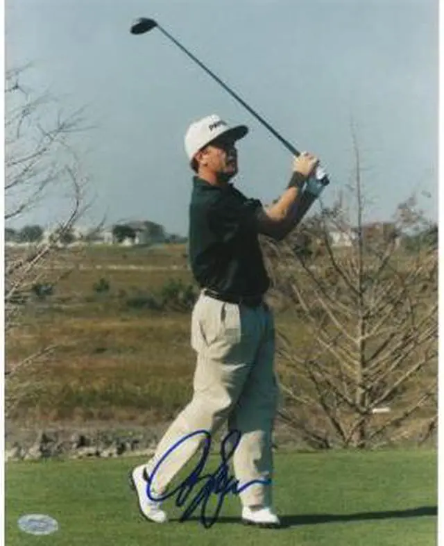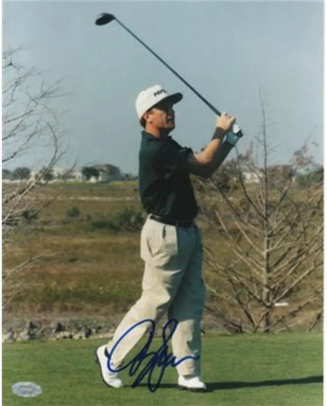 Jeff Sluman is an American professional golfer who has won numerous professional golf tournaments including six PGA Tour victories. He turned pro in 1980, and had regular career earnings in excess of 18 million dollars. Jeff Sluman has hand autographed this 8x10 Color Photo. Mounted Memories Hologram and Certificate of Authenticity.