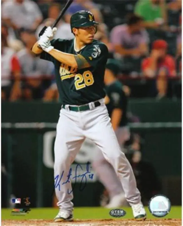 The Oakland Athletics drafted Suzuki in the second round of the 2004 Major League Baseball Draft. On September 10, 2007, Suzuki hit his first career grand slam in the second inning against the Mariners in Seattle. During the 2009 season, Suzuki had a career high 15 home runs, and 88 RBIs, and batted .274 in 147 games. Suzuki lead the A's in RBIs, and became only the second catcher in the franchise's history to do so. He also lead the team in hits (156), doubles (37) and total bases (240). Kurt Suzuki has hand autographed this Oakland A's Color Photo. GTSM Hologram and Certificate of Authenticity from Athlon Sports.