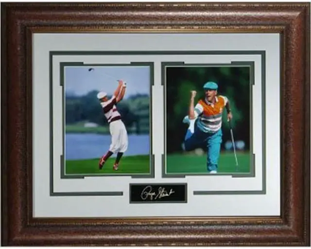 He won eleven Tour events, including the 1989 PGA Championship and the U.S. Open in 1991 and 1999. He was a two-time winner of the Hassan II Trophy in Morocco. At the time of his death, he was ranked third on the all-time money list and in the top 10 of the Official World Golf Rankings—he had been ranked in the top 10 for almost 250 weeks, from 1986 to 1993 and again in 1999. A beautiful 2 photo commemorative tribute, leather framed as shown with classic images from Payne Stewart and the Laser Engraved Replica Signature , to an overall size of 21x25".