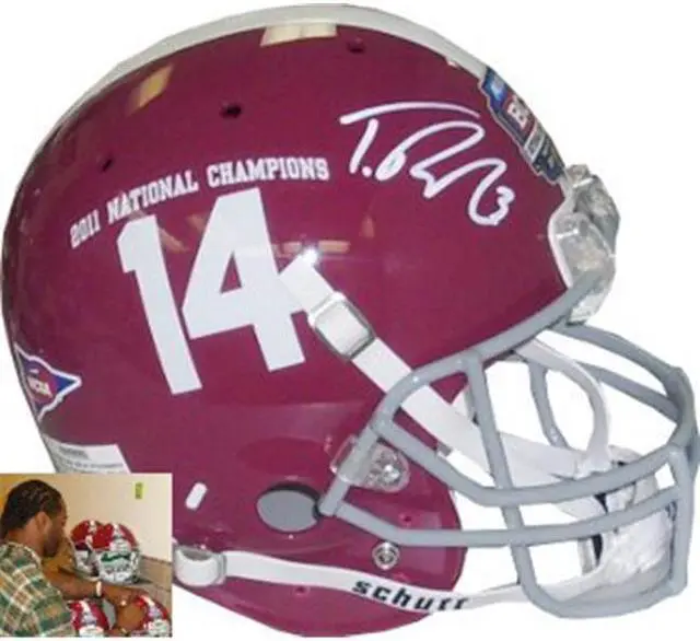 Trent Richardson played runningback at the University of Alabama. During his three year tenure, he helped lead Alabama to two BCS National Championships and a SEC Championship. He was a consensus All-American, Doak Walker Award winner and a Heisman Trophy finalist in 2011. Trent Richardson has hand signed this Alabama Crimson Tide Full Size Authentic Schutt #14 Helmet with BCS National Champs Logo. Special BCS Champs Logo on Front, 2011 National Champs Logo on Sides and 2011 Schedule With Scores Logo on Back of Helmet. Photo of the signing, FI Hologram and Certificate of Authenticity from Athlon Sports. Private signing in Huntsville, Alabama- March 3rd, 2012.