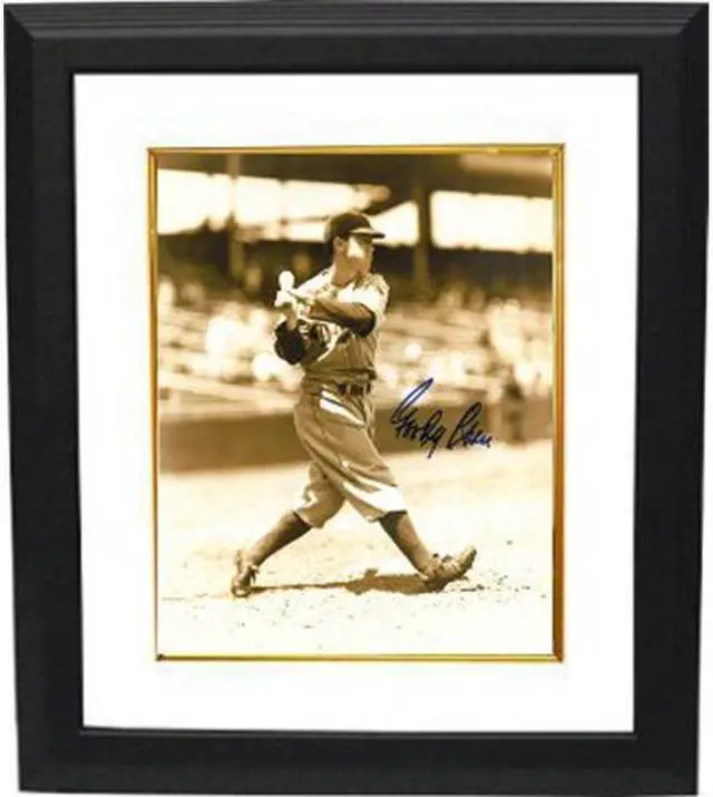 Goody Rosen broke into the major leagues in 1937, hitting .312 in 22 games with the Dodgers. In 1938, his first full season, he hit .281, finishing sixth in the National League in triples (11) and leading all league outfielders in fielding percentage (.989) and assists (19). With the Dodgers, he enjoyed the best year of his career in 1945, finishing 10th in voting for Most Valuable Player Award with a .325 batting average (3rd in NL), 197 hits (2nd), 126 runs (2nd), 11 triples (3rd), 606 at bats (6th) and a .460 slugging percentage (6th), a .379 on base percentage (9th), 14 sacrifice hits (10th), 12 home runs and 19 outfield assists. In that season, he also had the distinction of being the first Canadian major leaguer to be named to the All-Star Game. Goody Rosen has hand signed this Brooklyn Dodgers Vintage Sepia tone 8x10 Photo. Certificate of Authenticity from Athlon Sports. Custom White Mat and Premium Black Frame as shown.