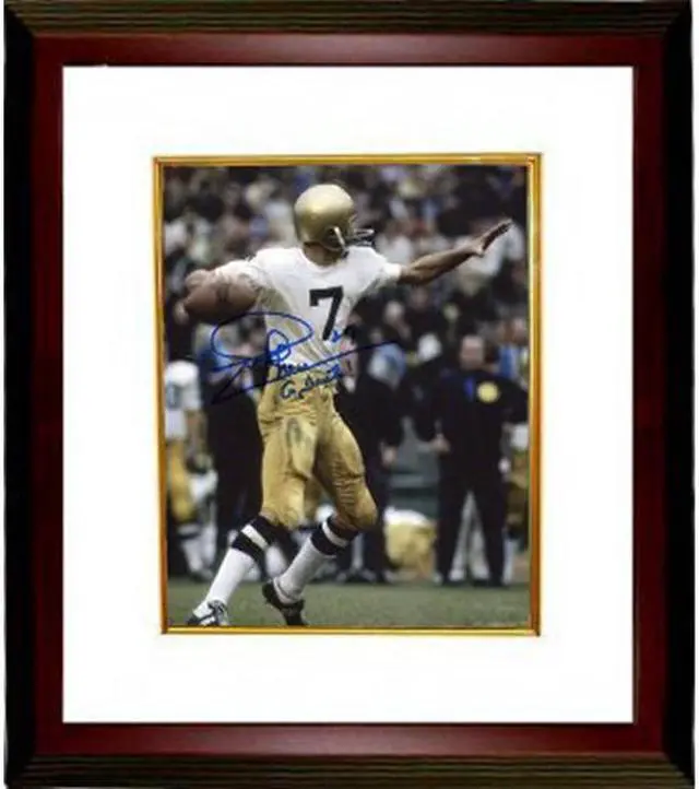 Joe Theismann attended and played college football for the University of Notre Dame. In 1969, Theismann led the Irish to a number five ranking and their first bowl appearance in 45 years. The next year, the Irish had a 10–1 record, a number two ranking, and won against Texas in the 1971 Cotton Bowl Classic, 24–11. That year, Theismann was an All-American and an Academic All-America, and was in contention for the Heisman Trophy. Theisman was inducted into the College Football Hall of Fame in 2003. Joe Theismann has hand autographed this Notre Dame Fighting Irish 8X10 Photo with Go Irish inscription. Leaf Authentics hologram and Certificate of Authenticity from Athlon Sports. Custom White Mat and Premium Mahogany Color Framed as shown.