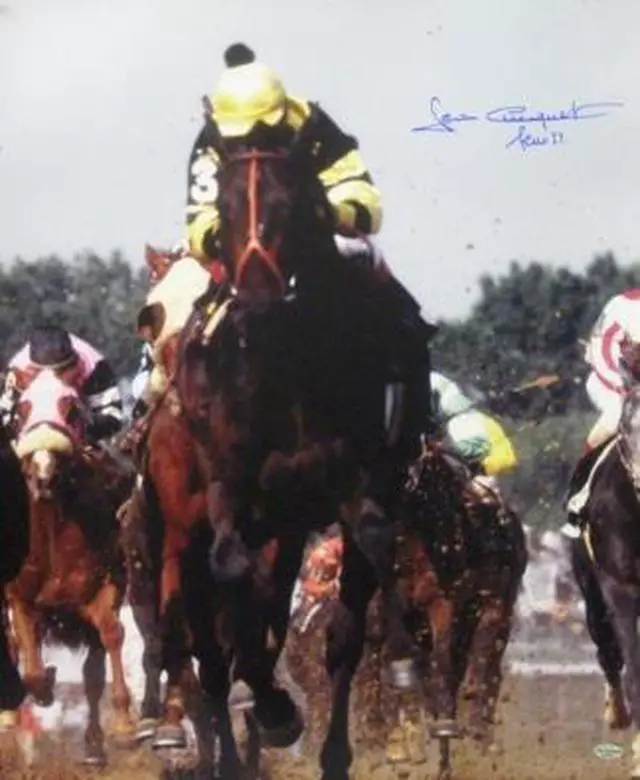 Seattle Slew's journey to winning the Triple Crown started on May 7, 1977, when the thoroughbred and jockey Jean Cruguet overcame a bad start to win the Kentucky Derby. Jean Cruguet has hand signed and dated this striking 16x20 photo of Seattle Slew taking the lead during that memorable race at Churchill Downs with SLEW 77 inscription. A Leaf Authentics Hologram and Certificate of Authenticity from Athlon Sports.