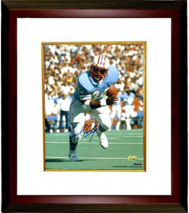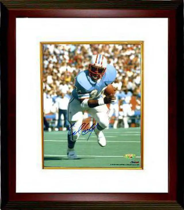 Earl Campbell was the first draft pick overall in the 1978 NFL Draft by the Houston Oilers, and in that year he was named the Offensive Rookie of the Year by the Associated Press as well as the Most Valuable Player. The Luv Ya Blue era in Houston was due mostly to Campbell's running ability and Coach Bum Phillips' "good ole boy" personality. Campbell possessed a rare combination of speed and power, and was a prolific running back from 1978 through 1985. His outstanding single-season performance in 1979 earned him All-Pro, Pro Bowl, and NFL Offensive Player of the Year honors. Earl Campbell has hand autographed this Houston Oilers 8x10 Photo. Tri-Star Hologram and Certificate of Authenticity from Athlon Sports. Custom White Mat and Premium Mahogany Color Framed as shown
