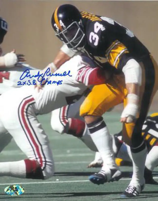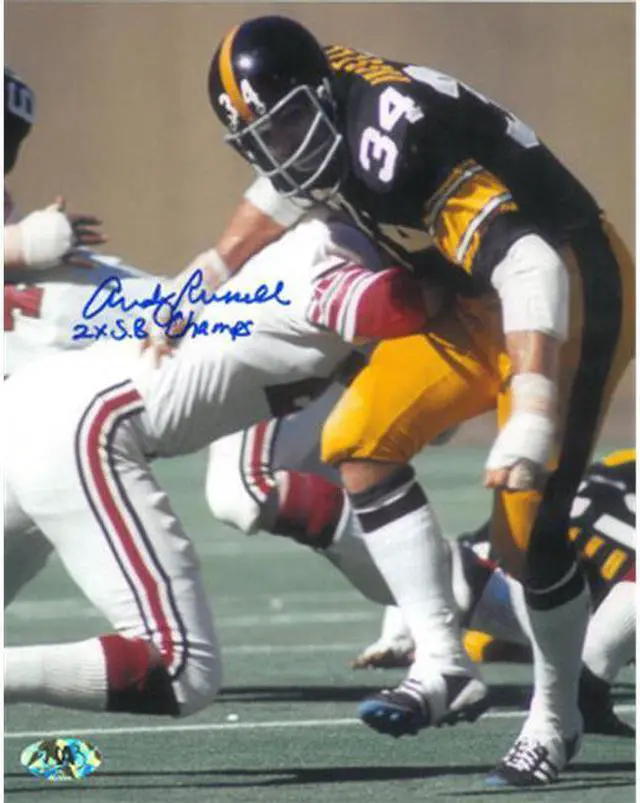 Andy Russell wore number 34 as an outside linebacker for the Pittsburgh Steelers in 1963 and from 1966-1976, the two-year gap being from when Russell temporarily left the team for the Army. He was an early member of Pittsburgh's famed Steel Curtain defense, and was named the Steelers' MVP in 1971. He made seven Pro Bowl appearances—in 1969 and from 1971 through 1976—and earned two Super Bowl rings in Super Bowl IX and Super Bowl X. Andy Russell has hand autographed this Pittsburgh Steelers 8x10 Photo with 2X SB Champs inscription. MAB Hologram and Certificate of Authenticity from Athlon Sports.