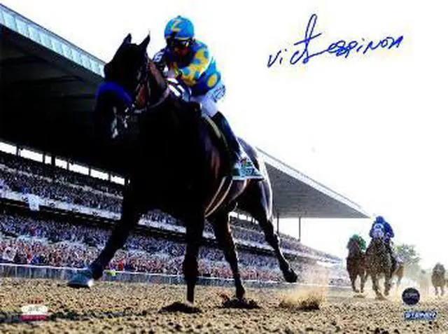 American Pharoah won the American Triple Crown in 2015. He is bred and owned by Ahmed Zayat of Zayat Stables, LLC, trained by Bob Baffert and ridden in most of his races by Victor Espinoza. He is the first American Triple Crown winner since Affirmed in 1978 and only the twelfth in history. American Pharoah won the 2015 Kentucky Derby and 2015 Preakness Stakes. He won the Triple Crown in a wire-to-wire victory at the Belmont Stakes with his time the second-fastest for a Triple Crown winner and his closing quarter-mile time of 24.32 was actually faster than Secretariat's.Victor Espinoza has hand signed this 16x20 Photo on American Pharoah from the Belmont Stakes. Steiner Sports Hologram and Certificate of Authenticity.