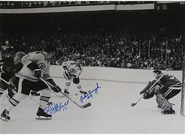 Johnny Bucyk was a hockey left winger and member of the Hockey Hall of Fame. Having played most of his career with the Boston Bruins, he has been associated in one capacity or another with the Bruins' organization since the late 1950s. When the Bruins became a powerhouse in the late Sixties Bucyk proved particularly effective playing on the left side on Boston's greatly feared power play unit, which featured Phil Esposito and Fred Stanfield. Fred Stanfield played 14 seasons in the National Hockey League from 1964 until 1978. He won two Stanley Cups with the Boston Bruins, in 1970 and 1972. Johnny Bucyk and Fred Stanfield have both signed this Boston Bruins 16x20 Photo. Certificate of Authenticity from Athlon Sports Collectibles.