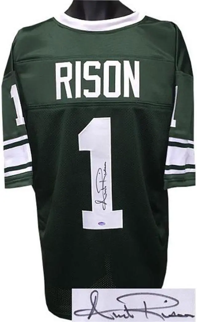 This is a new, in stock, Andre Rison signed Green TB unlicensed Custom Stitched Football Jersey with fully stitched twill numbers on the front and back and players name plate, there are NO LOGOS, TAGS, BRAND NAMES or PATCHES ON THIS JERSEY & IS NOT AN AUTHENTIC OFFICIALLY LICENSED JERSEY, 100% polyester, made in the Philippines. Size XL (48/50). Schwartz Sports Hologram and Certificate of Authenticity from Athlon Sports Collectibles.