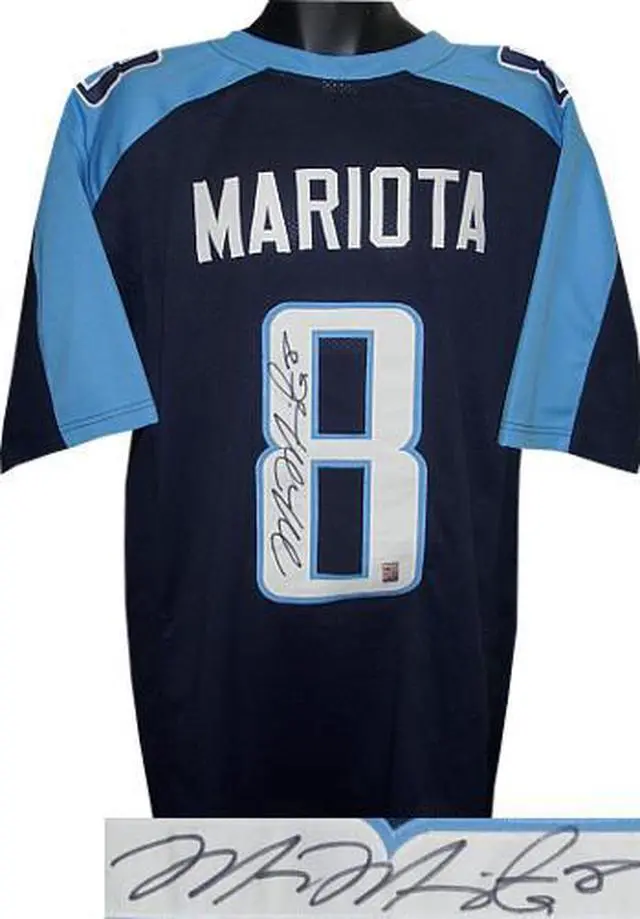 This is a new, in stock, Marcus Mariota signed Blue unlicensed Custom Stitched Pro Style Football Jersey with fully stitched twill numbers on the front and back and players name plate, there are NO LOGOS, TAGS, BRAND NAMES or PATCHES ON THIS JERSEY & IS NOT AN AUTHENTIC OFFICIALLY LICENSED NFL JERSEY, 100% polyester, made in the Philippines. Size XL (48/50). Private Signing September 29th 2015 in Nashville, Tennessee. Photo of the Signing, Mariota Hologram and Certificate of Authenticity from Athlon Sports Collectibles.