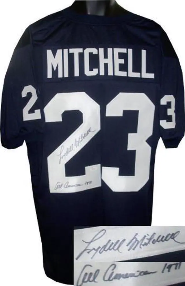 This is a new, in stock, Lydell Mitchell signed Navy Throwback unlicensed Custom Stitched Football Jersey with All American 1971 inscription, with fully stitched twill numbers on the front and back and players name plate, there are NO LOGOS, TAGS, BRAND NAMES or PATCHES ON THIS JERSEY & IS NOT AN AUTHENTIC OFFICIALLY LICENSED NCAA JERSEY, 100% polyester, made in the Philippines. Size XL (48/50). JSA Hologram and Certificate of Authenticity.