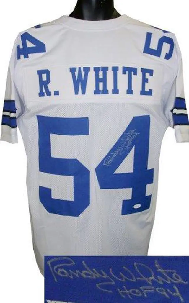 This is a new, in stock, Randy White signed White Throwback unlicensed Custom Stitched Pro Style Football Jersey with HOF 94 inscription, with fully stitched twill numbers on the front and back and players name plate, there are NO LOGOS, TAGS, BRAND NAMES or PATCHES ON THIS JERSEY & IS NOT AN AUTHENTIC OFFICIALLY LICENSED NFL JERSEY, 100% polyester, made in the Philippines. Size XL (48/50). JSA Hologram and Certificate of Authenticity.