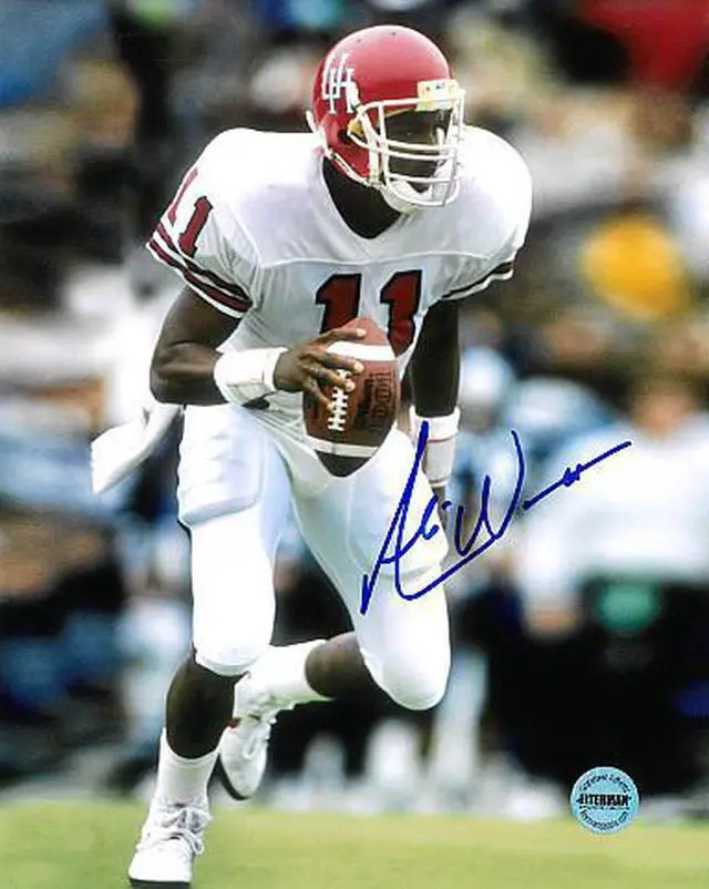 Andre Ware played at the University of Houston, where he was the first black quarterback to win the Heisman Trophy in 1989, along with the Davey O'Brien Award, the latter award given to the most outstanding college quarterback of the year. That year, his junior year, he threw for 4,699 yards, 44 touchdowns, and set 26 NCAA records. The Cougars ended the season ranked the #6 team in the nation by the Associated Press. Andre Ware has hand autographed this Houston Cougars 8x10 Color Photo. Fiterman Hologram and Certificate of Authenticity from Athlon Sports Collectibles.