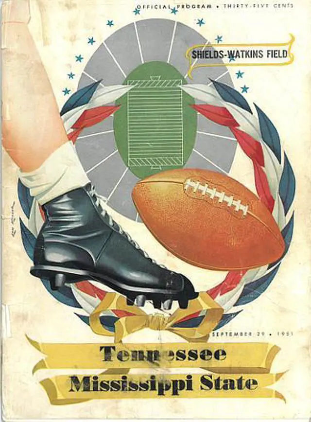 This is a Tennessee Volunteers vs Mississippi State Bulldogs College Football Game Program- September 1, 1951. Image of actual item instock - as shown/as is. Cover has wear.